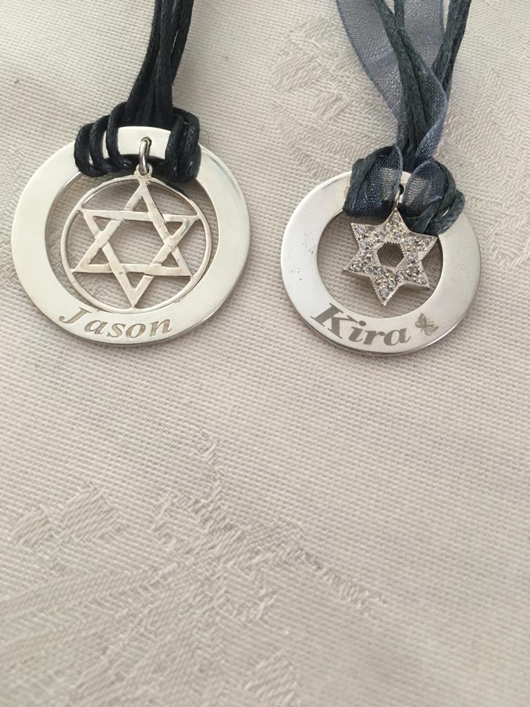 participant and the name of their twin to be engraved on the circle, along with the date of the Bar / Batmitzvah. Included with the necklace as optional extras, are various attractive silver charms that can be attached to hang within the circle.